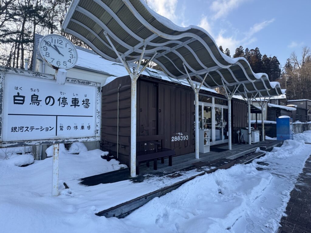 バスを降り、宮沢賢治童話村の駐車場内にある「白鳥の停車場」に行きました。